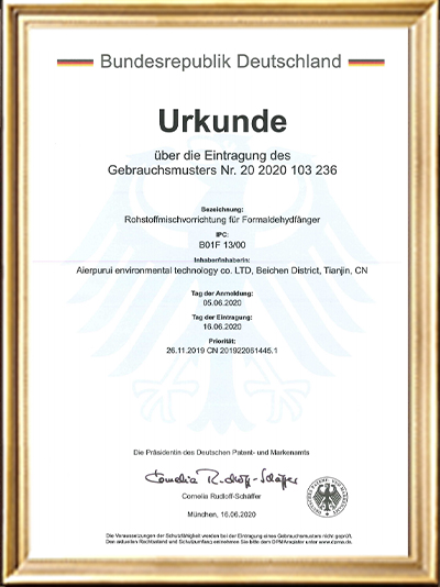 • 實用新型專利證書(一種甲醛清除劑的原料混合